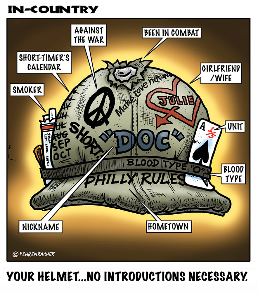 Phil enlisted in the Army in 1965 where you served for years in Vietnam. He became a graphic designer and has worked for the state of Oregon for 26 years. He retired in 2003 and started the Cartoon "In-Country". The cartoons reflect his experiences during his tour of duty in South Vietnam.